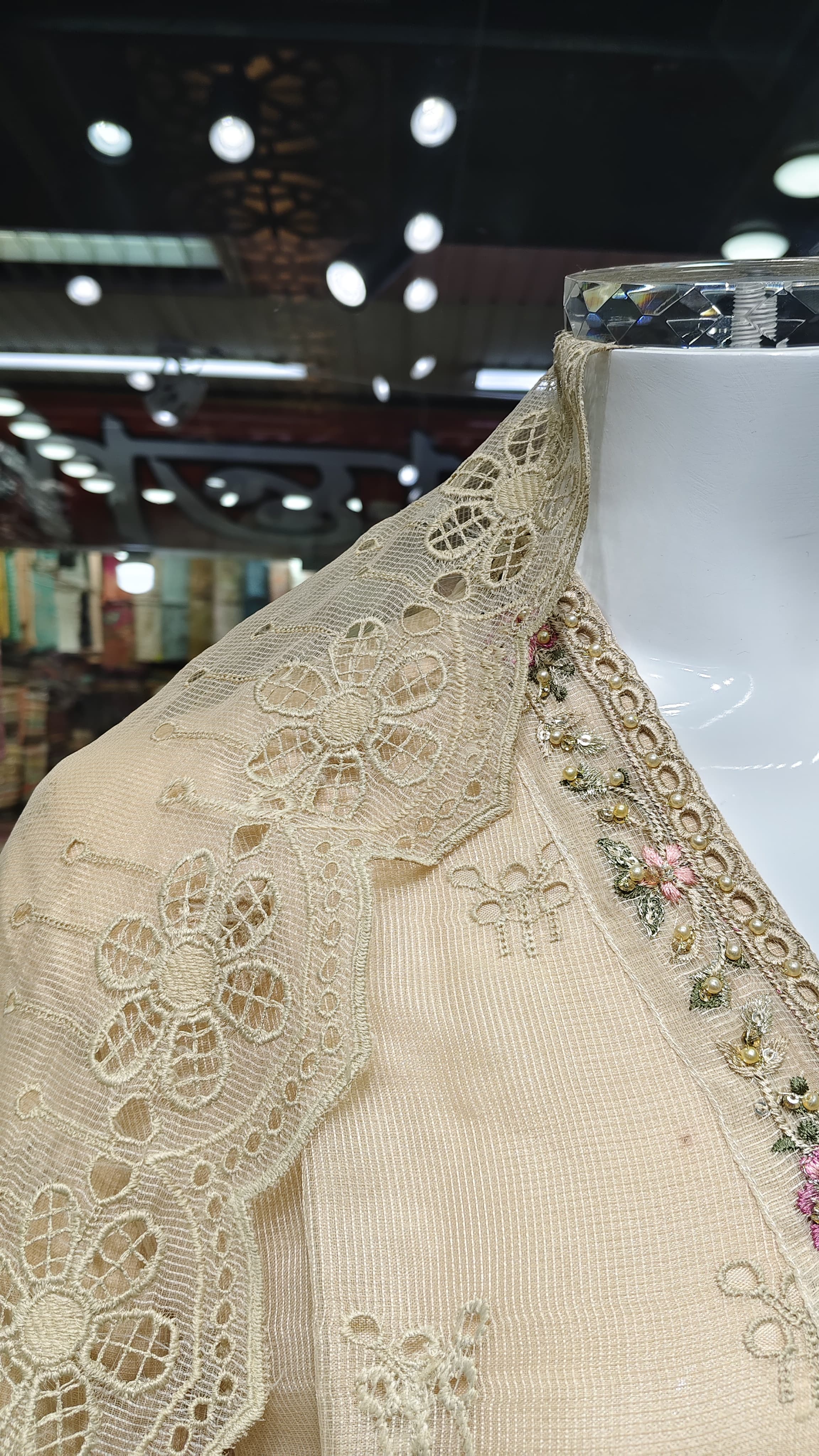 নেট ফ্যাব্রিকের দোপাট্টায় চারপাশে লেইস ও সূক্ষ্ম এমব্রয়ডারি, যা একে দেয় সফট, ফ্লোয়ি আর রিফ্রেশিং লুক।