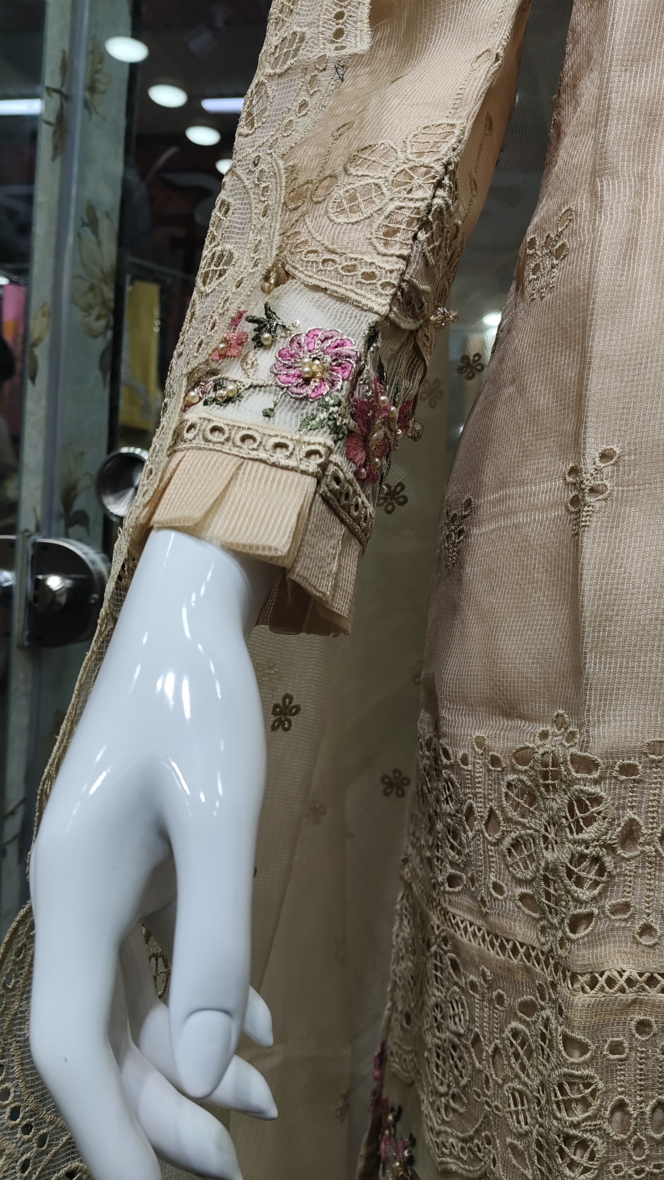 বেবি পিঙ্ক রঙের ওপর জ্যামিতিক থ্রেড ওয়ার্ক, পুঁতির কাজ এবং ফুলের ডিজাইন পুরো শার্টকে করে তুলেছে একদম ইউনিক ও এলিগেন্ট।