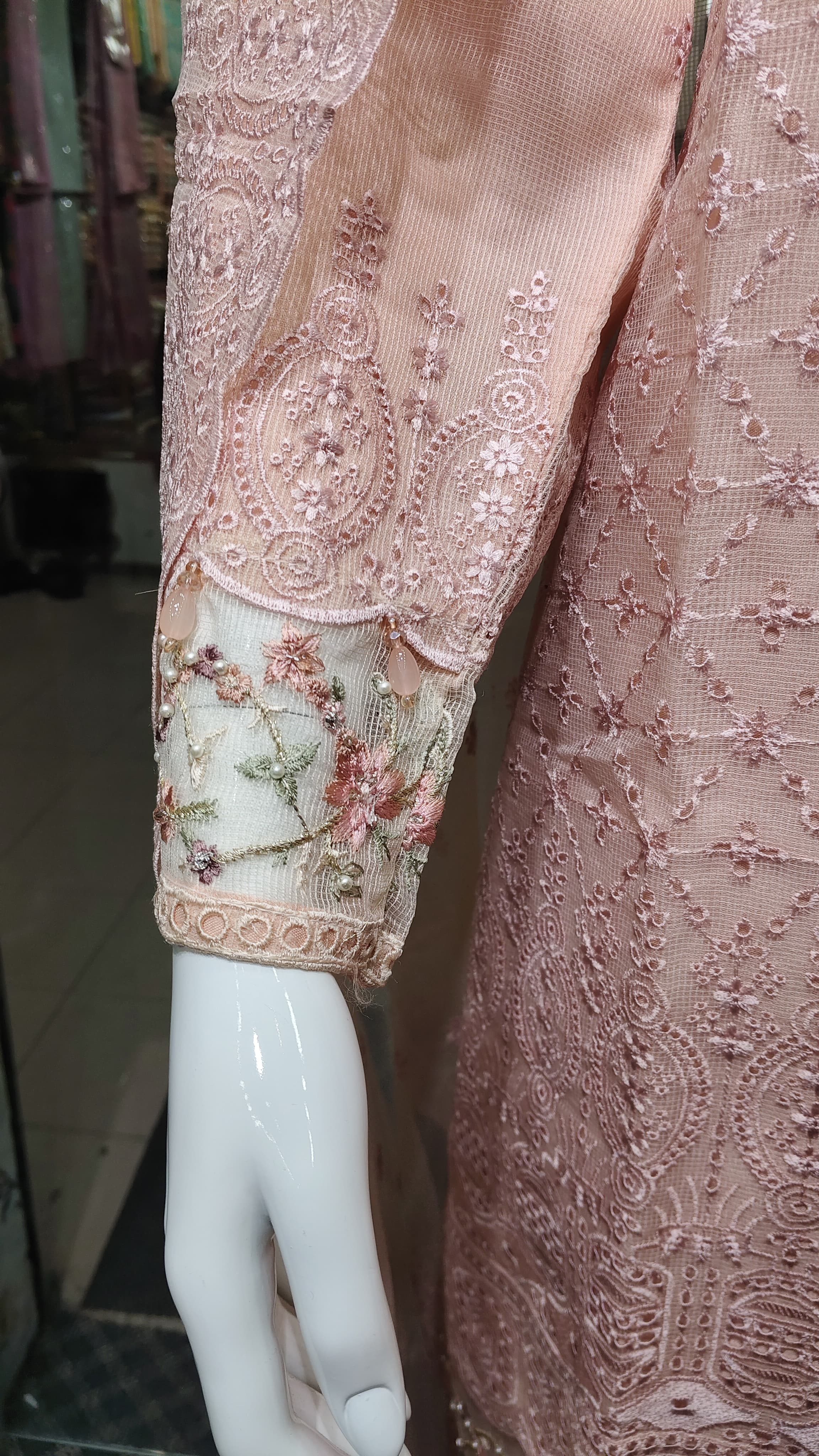 বেবি পিঙ্ক রঙের ওপর জ্যামিতিক থ্রেড ওয়ার্ক, পুঁতির কাজ এবং ফুলের ডিজাইন পুরো শার্টকে করে তুলেছে একদম ইউনিক ও এলিগেন্ট।