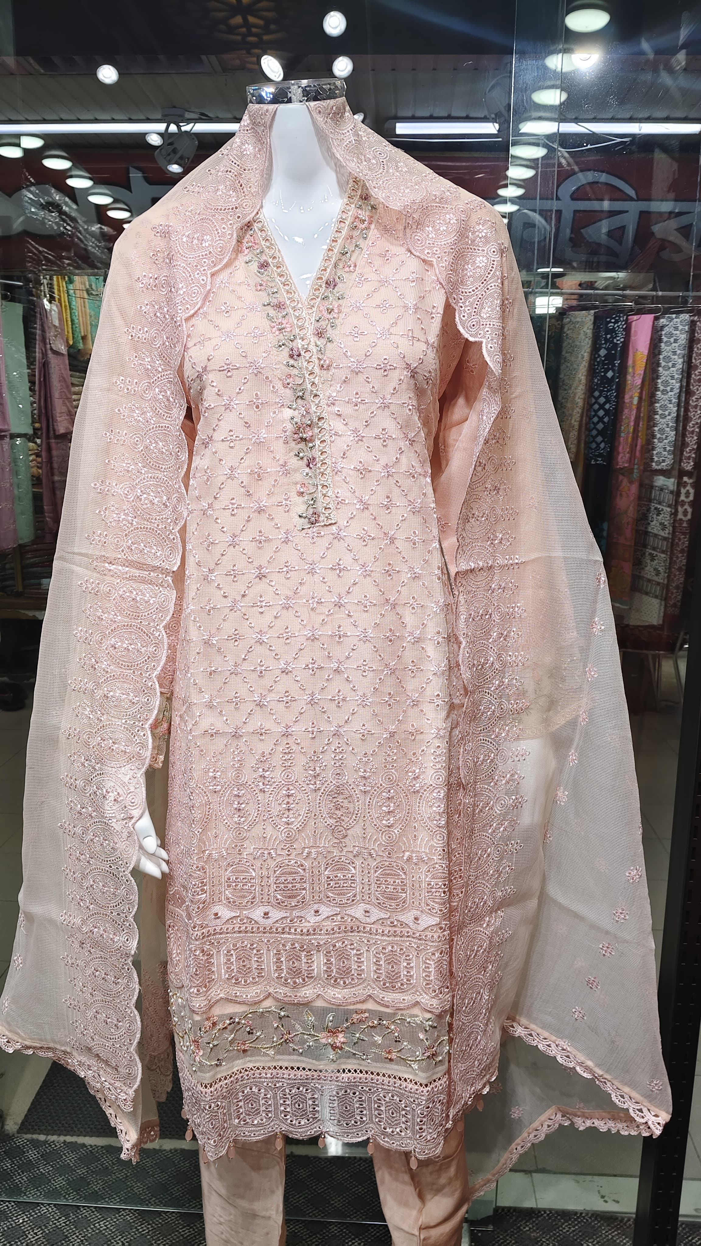 নেট ফ্যাব্রিকের দোপাট্টায় চারপাশে লেইস ও সূক্ষ্ম এমব্রয়ডারি, যা একে দেয় সফট, ফ্লোয়ি আর রিফ্রেশিং লুক।