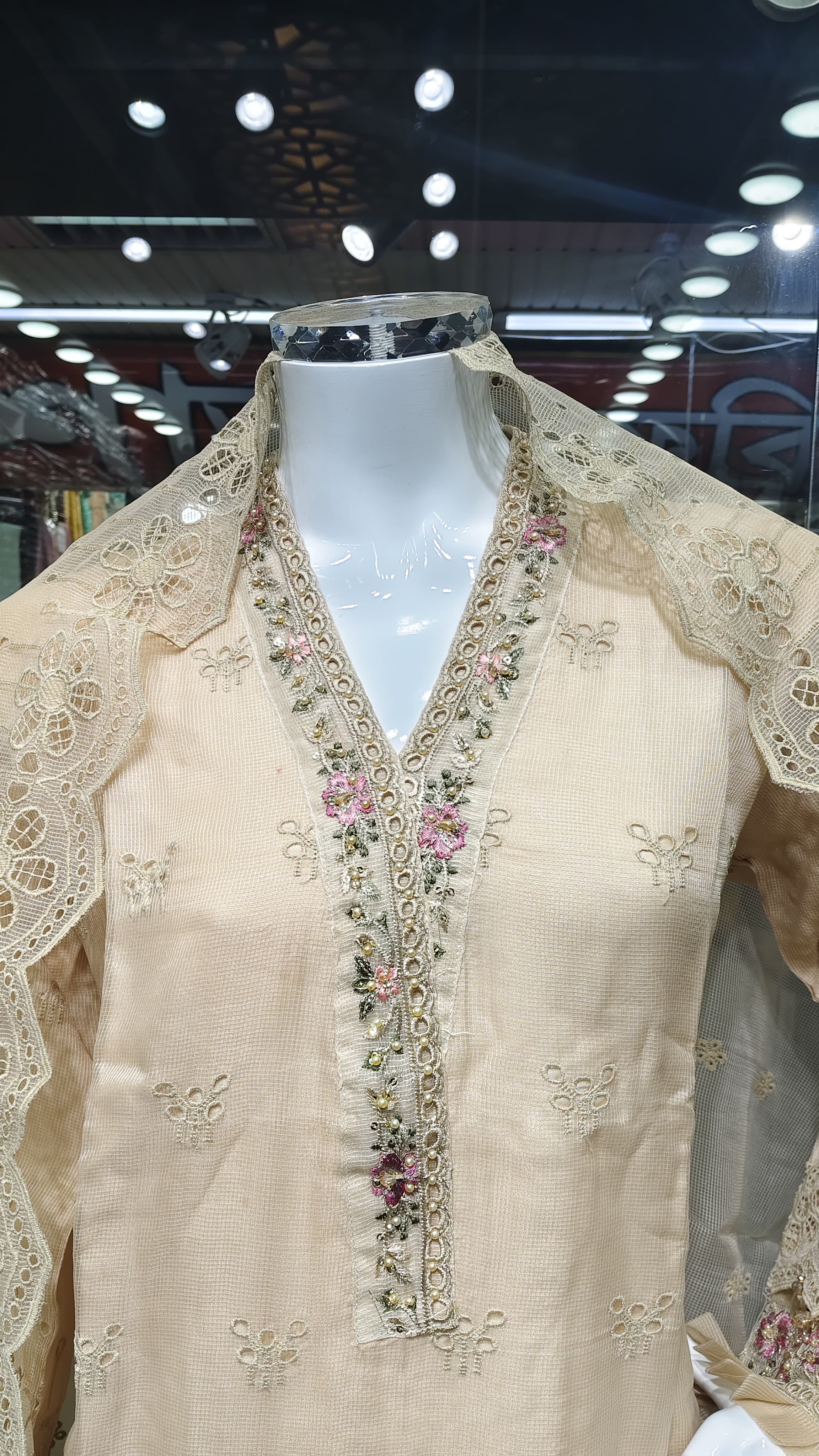 বেবি পিঙ্ক রঙের ওপর জ্যামিতিক থ্রেড ওয়ার্ক, পুঁতির কাজ এবং ফুলের ডিজাইন পুরো শার্টকে করে তুলেছে একদম ইউনিক ও এলিগেন্ট।