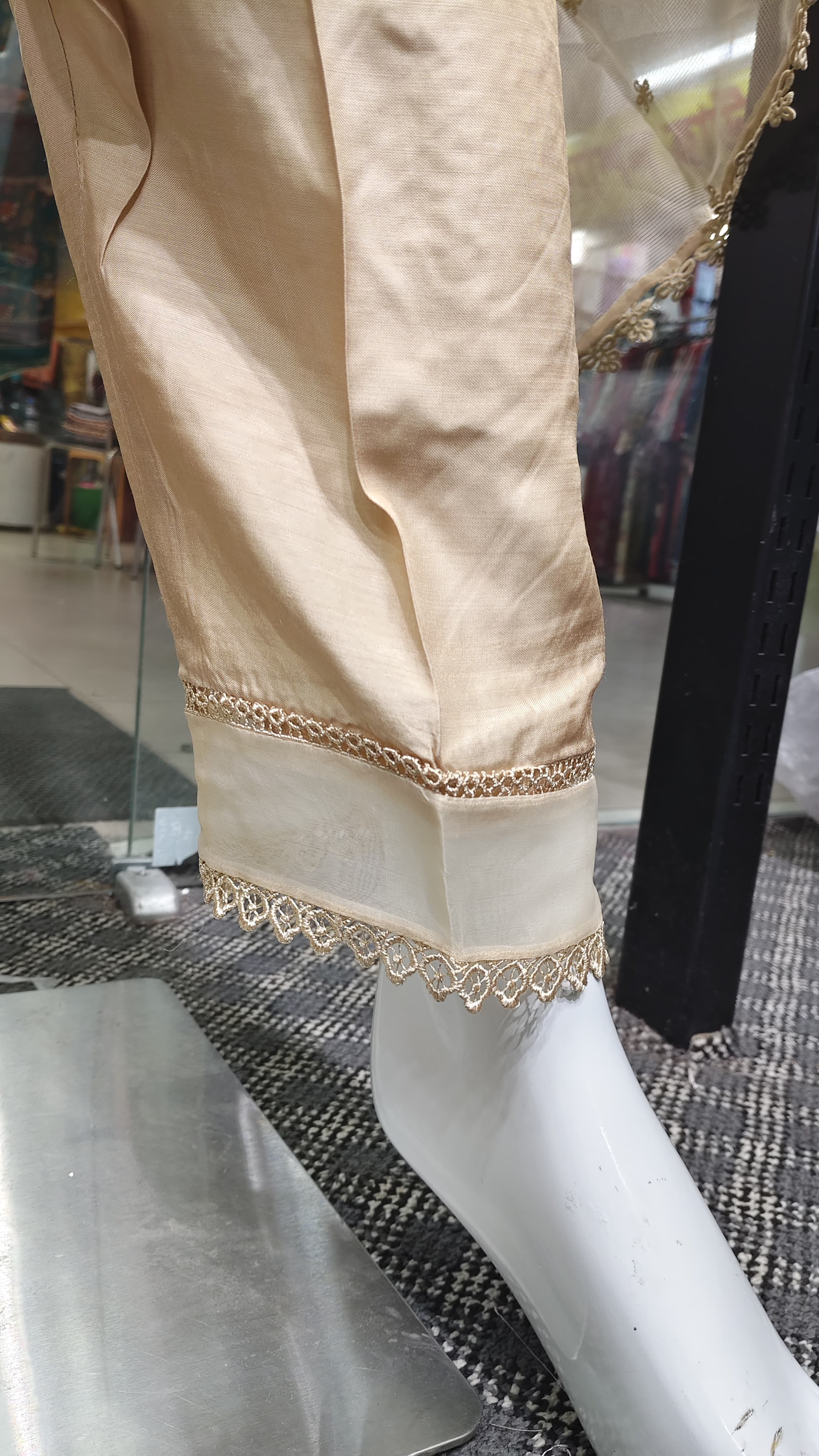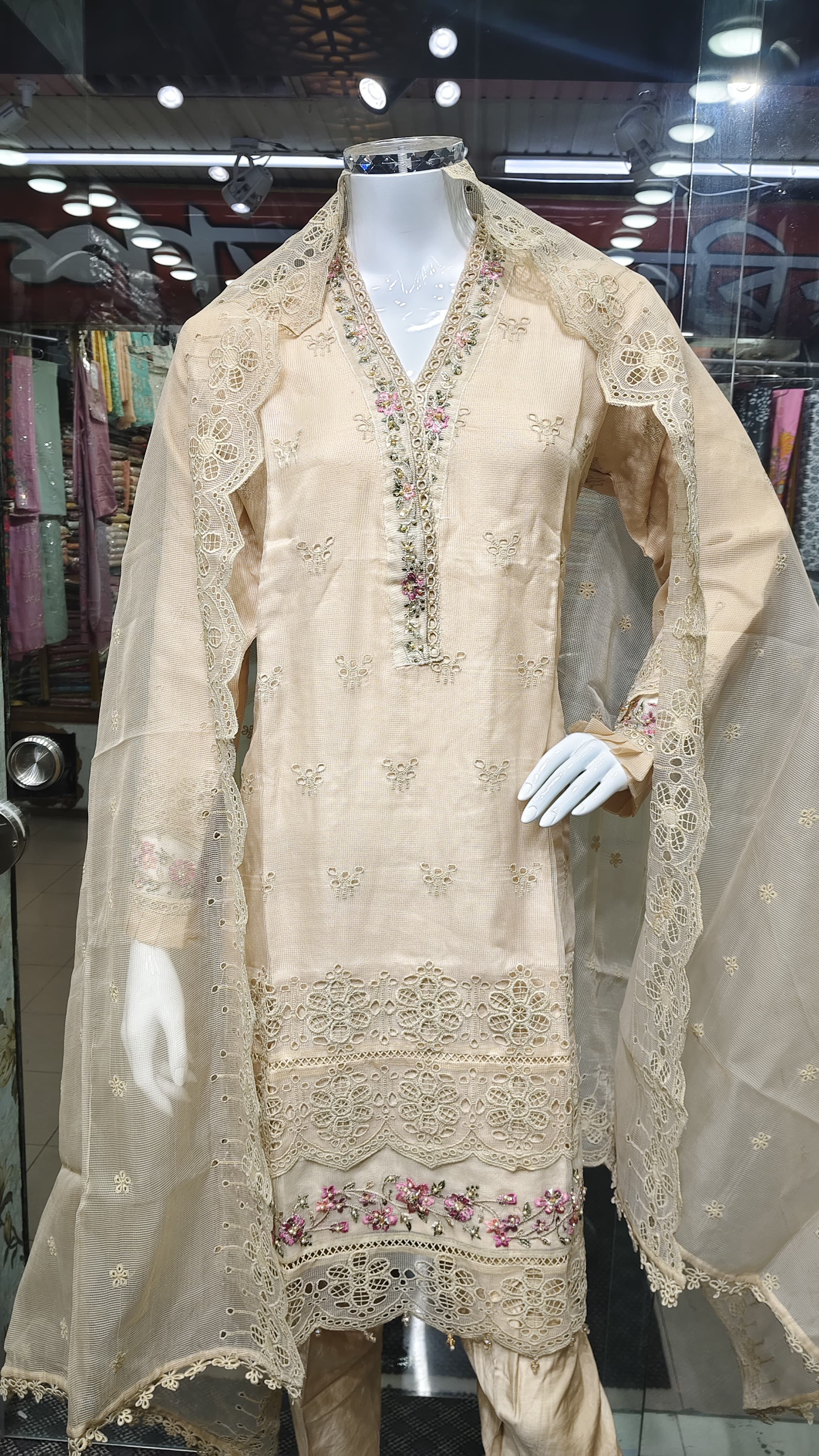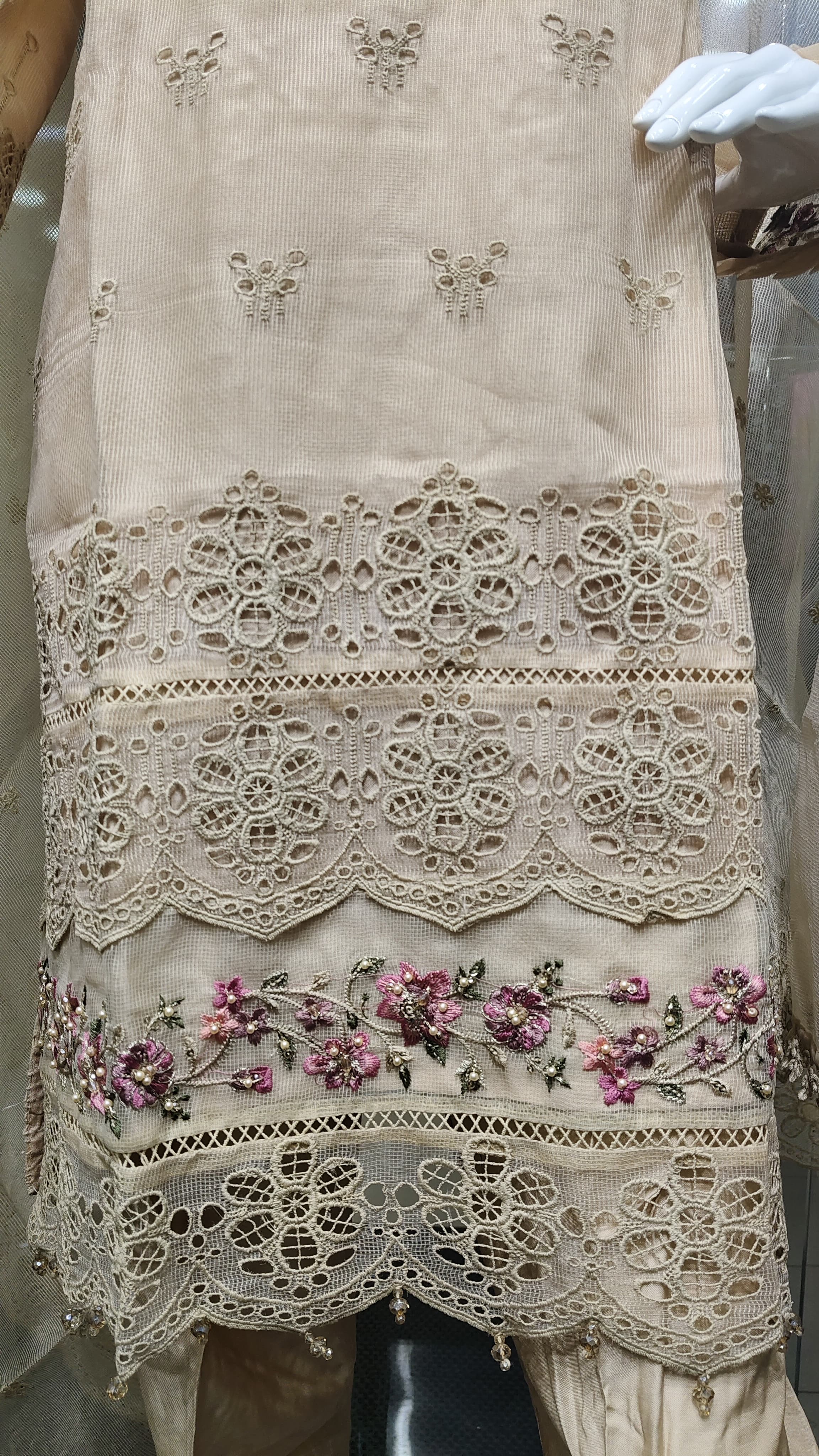 নেট ফ্যাব্রিকের দোপাট্টায় চারপাশে লেইস ও সূক্ষ্ম এমব্রয়ডারি, যা একে দেয় সফট, ফ্লোয়ি আর রিফ্রেশিং লুক।