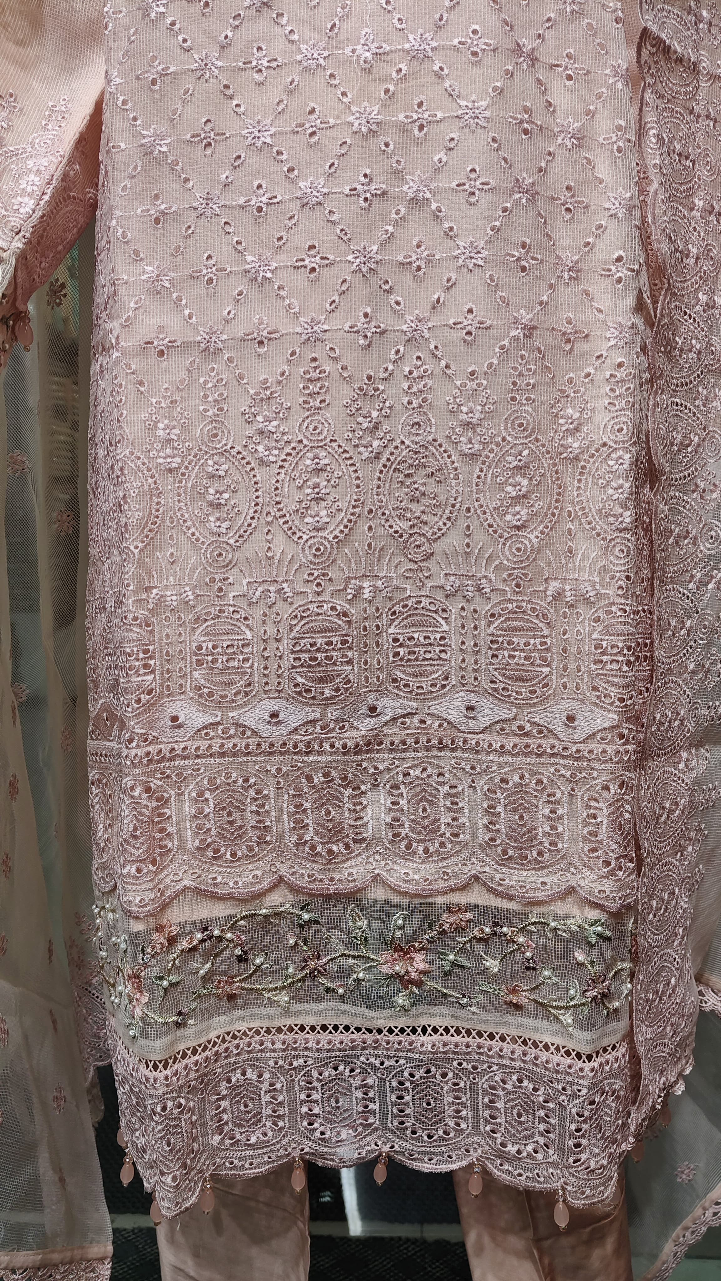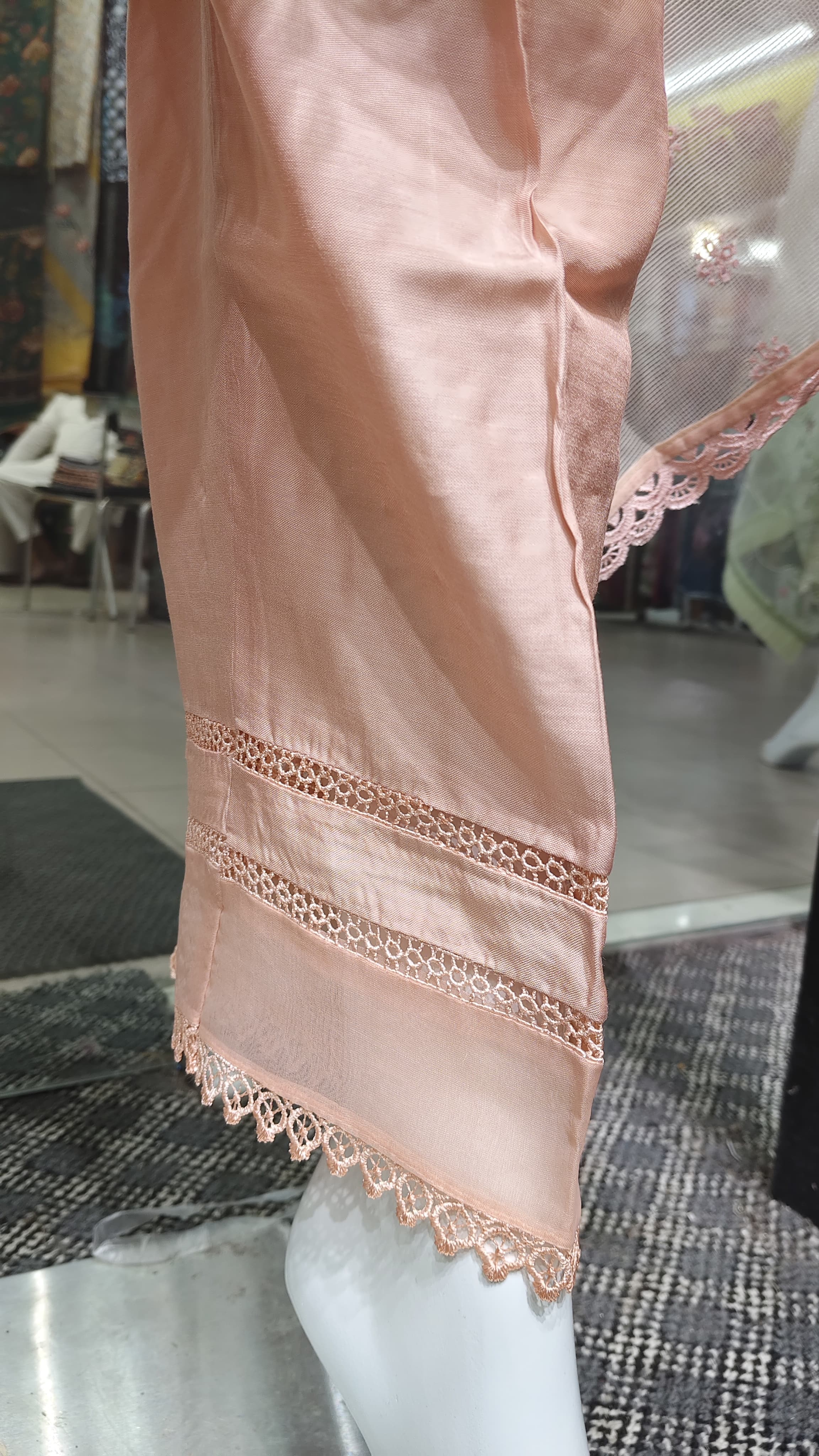 নেট ফ্যাব্রিকের দোপাট্টায় চারপাশে লেইস ও সূক্ষ্ম এমব্রয়ডারি, যা একে দেয় সফট, ফ্লোয়ি আর রিফ্রেশিং লুক।