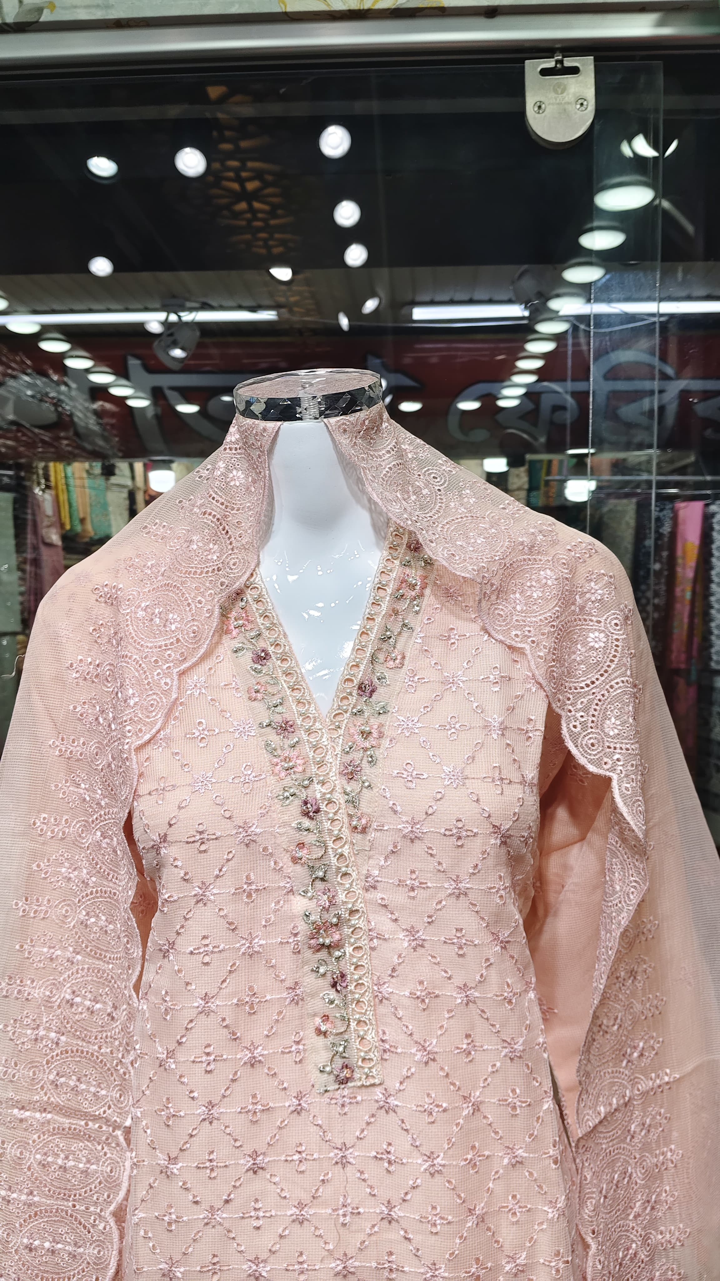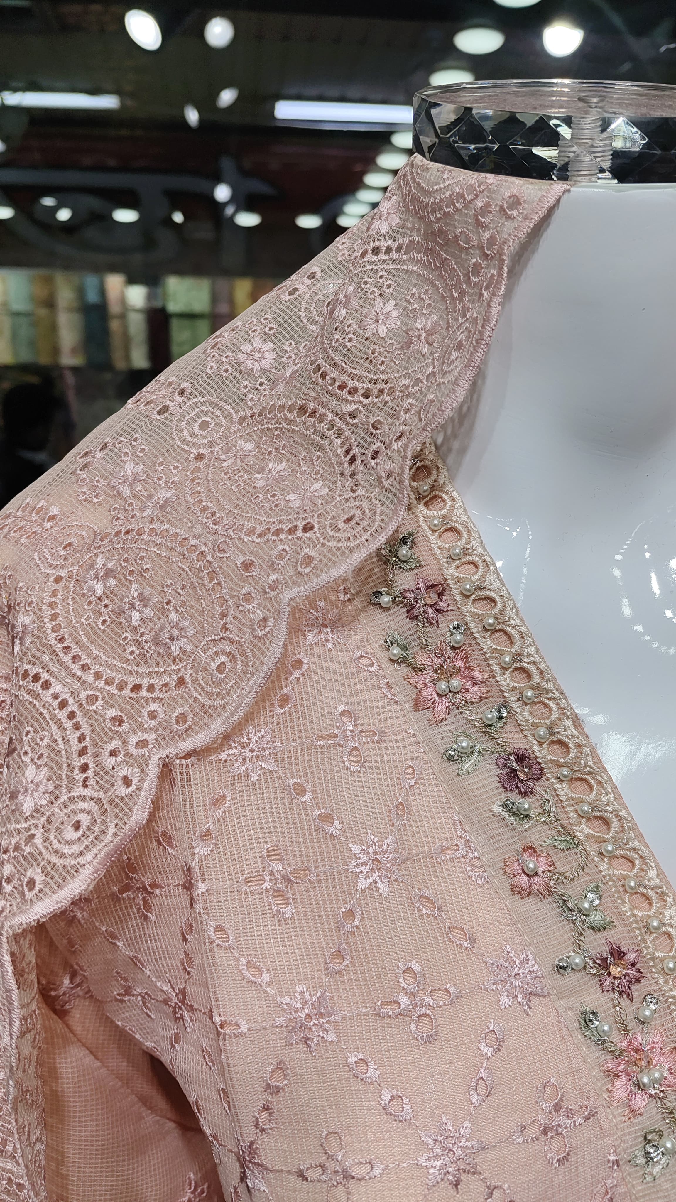 বেবি পিঙ্ক রঙের ওপর জ্যামিতিক থ্রেড ওয়ার্ক, পুঁতির কাজ এবং ফুলের ডিজাইন পুরো শার্টকে করে তুলেছে একদম ইউনিক ও এলিগেন্ট।